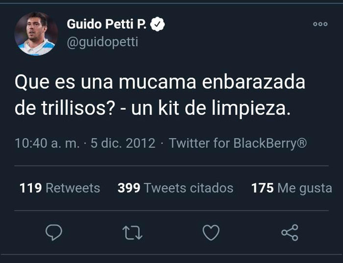 Y su compañero en la selección, Guido Petti, quizás para congraciarse con sus compañeros y con la propia UAR, escribió (con faltas de ortografía, claro): “¿Qué es una mucama embarazada de trillizos? Un kit de limpieza”.