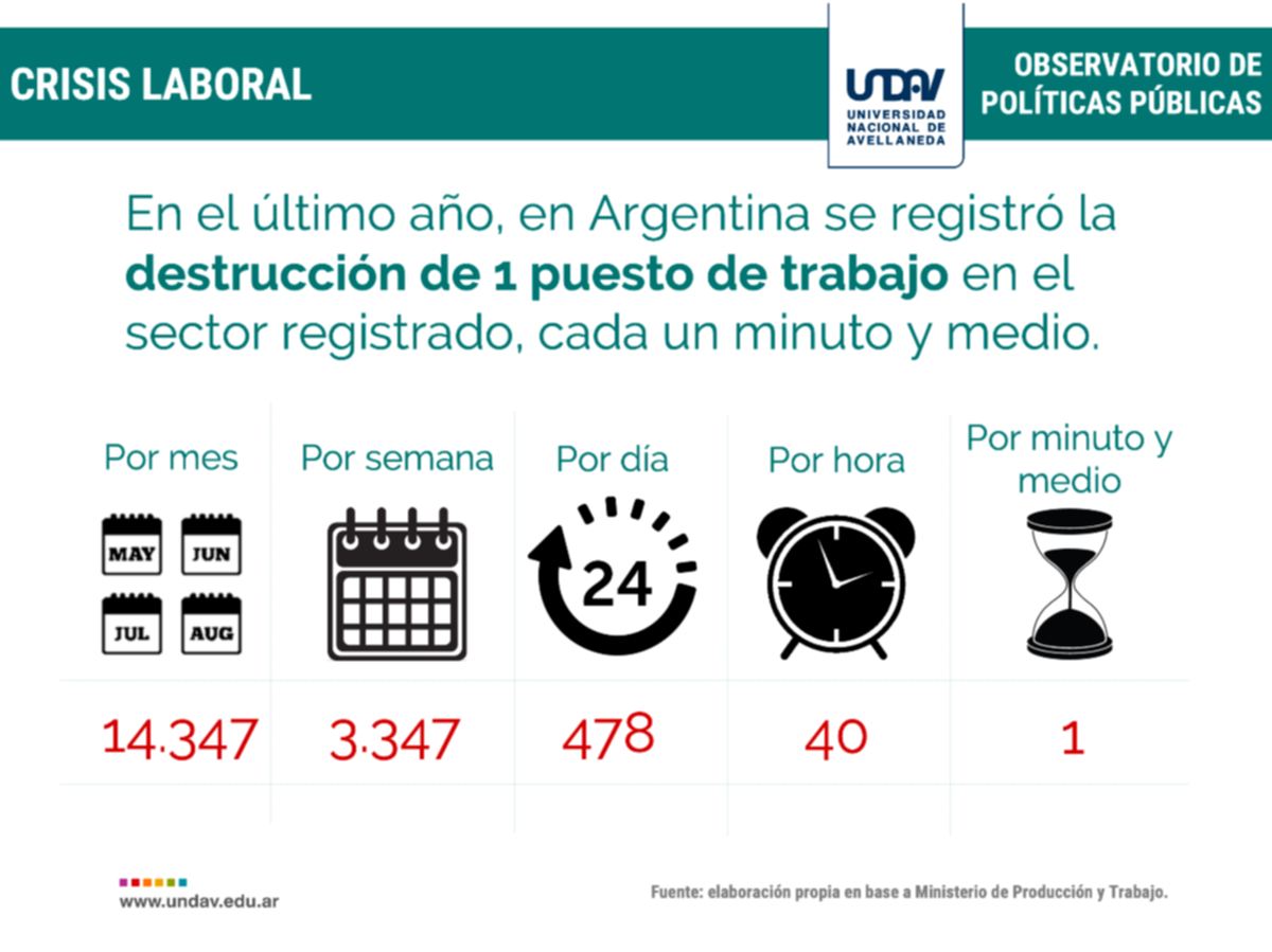 Las cifras reflejadas en el documento del Observatorio de Políticas Públicas de la Universidad Nacional de Avellaneda (UNDAV) significaron que entre junio de 2018 y junio de 2019, se perdieron 40 trabajos por hora, 478 cada día, y un equivalente de 14.347 por mes.
