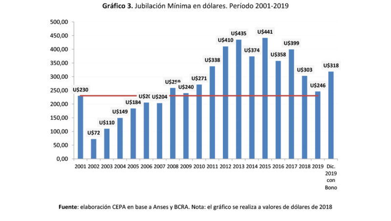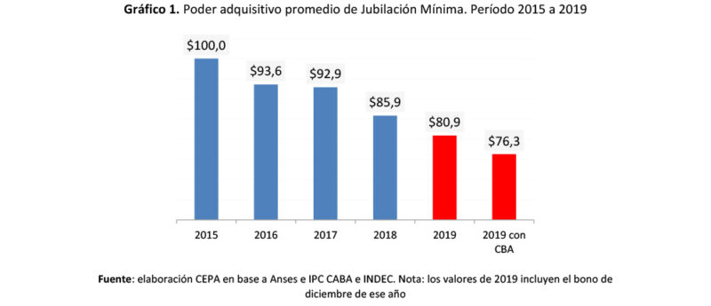 El poder adquisitivo del haber mínimo, considerando la evolución del IPC-INDEC y el Relevamiento de Expectativas de Mercado (REM) realizado mensualmente por el Banco Central de la República Argentina (BCRA), se retrajo 19,1% (por cada $100 que cobraba un jubilado de la mínima en 2015, en 2019 cobró el equivalente a $80,90) en la comparación entre el promedio de 2015 y el promedio de 2019, es decir, unos $2.673 mensuales, a valores de diciembre de 2019. Si se multiplica esa pérdida por doce meses, el monto anual alcanza los $32.075 para dicho período de comparación.