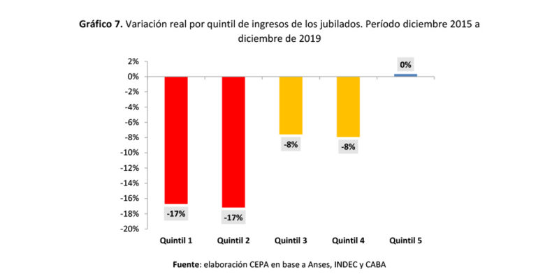 La pérdida de poder adquisitivo ha sido generalizada pero no uniforme. En análisis por quintiles en los últimos 4 años, muestra que los dos primeros quintiles (el 40% de menores ingresos) perdieron 18% en términos reales, mientras que los dos quintiles que siguen perdieron 9% y el quintil de mayores ingresos empató contra la inflación. Es decir, la sensible pérdida de poder adquisitivo no fue soportada de manera equitativa por el conjunto de jubilados.