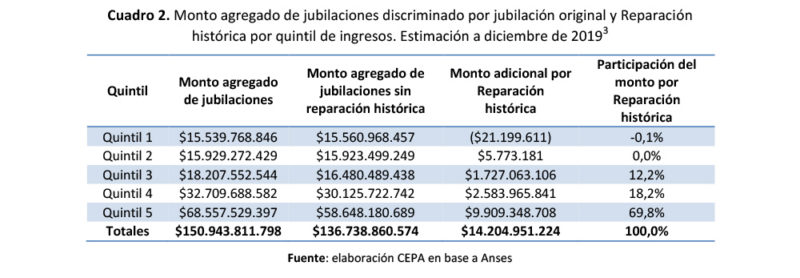 Es ilustrativo el gráfico a continuación: casi el 70% de los recursos vinculados con la Reparación Histórica fueron al 20% de las jubilaciones de mayores ingresos. El 40% de menores ingresos directamente no recibieron nada (probablemente porque se vinculan a jubilaciones por moratoria) y los quintiles de ingresos 3 y 4 se quedan con 12,2% y 18,2% respectivamente.
