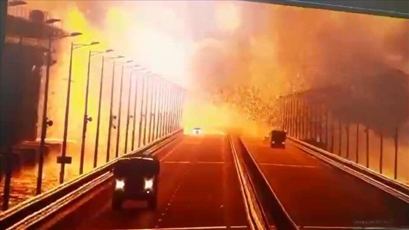 A strong fire on the Crimean rail bridge in the city of #Kerch. According to some reports, the train is on fire and explosions are heard. #Crimea #Fire #Russia #Ukraine #news #BREAKING #BreakingNews pic.twitter.com/Y9W29uwAe5