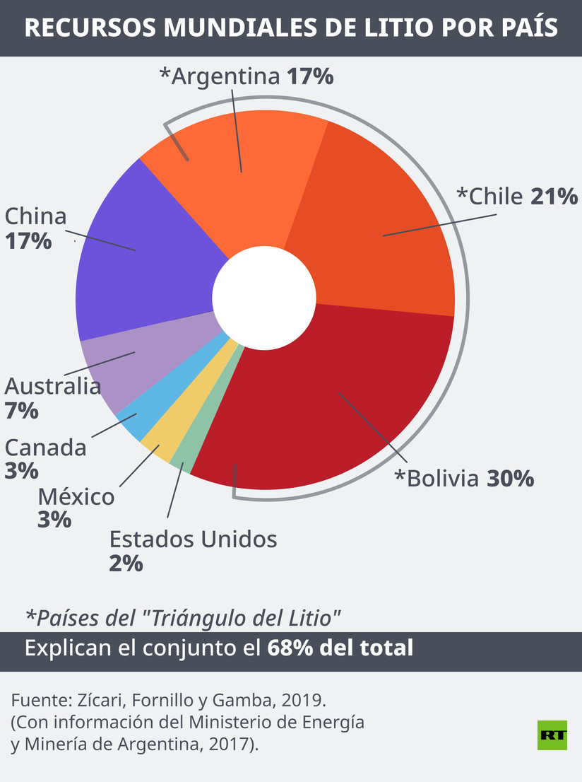 Bolivia posee el 30 % de las reservas mundiales de litio, seguido de Chile, con 21 %, y Argentina, con 17 % del total, según el estudio ‘El mercado mundial del litio y el eje asiático. Dinámicas comerciales, industriales y tecnológicas (2001-2017)’, realizado por Julián Zícari, Bruno Fornillo y Martina Gamba.