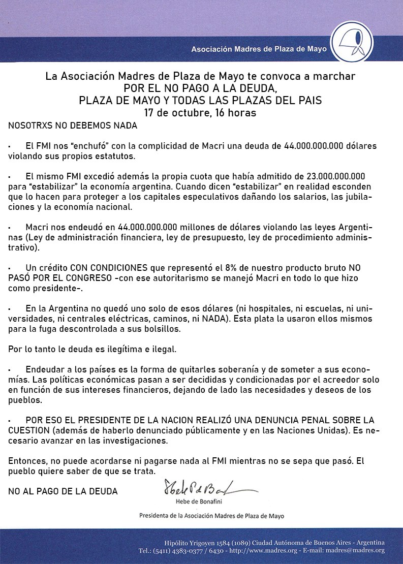 La Asociación Madres de Plaza de Mayo convoca a marchar en las plazas de todo el país, el 17 de octubre, por el «No pago a la deuda». El comunicado expresa «Macri nos endeudó en 44.000.000.000 millones de dólares violando las leyes Argentinas», y terminó diciendo «no puede acordarse ni pagarse nada al FMI mientras no se sepa que pasó. El pueblo quiere saber de que se trata».