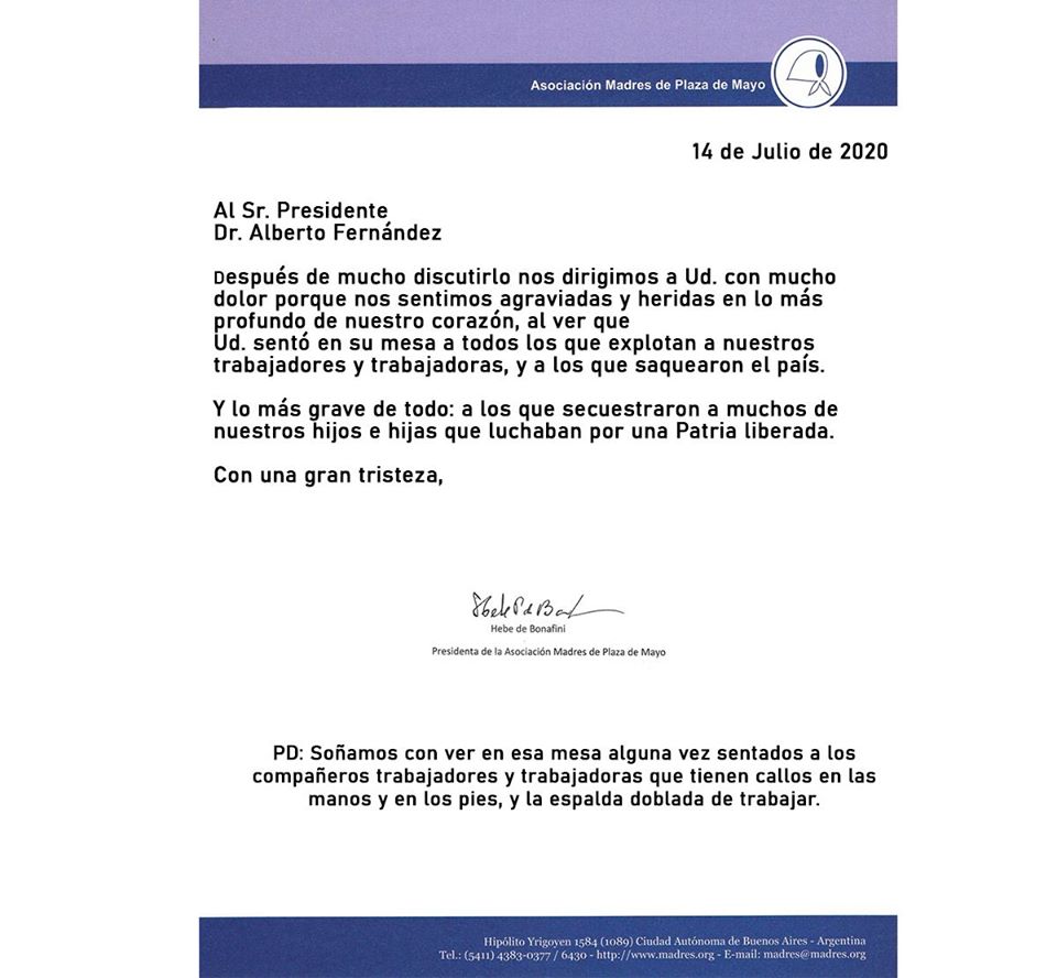 A través de una carta enviada al jefe de Estado, Bonafini añadió: «Soñamos con ver en esa mesa alguna vez sentados a los compañeros trabajadores y trabajadoras que tienen callos en las manos y en los pies, y la espalda doblada de trabajar».
