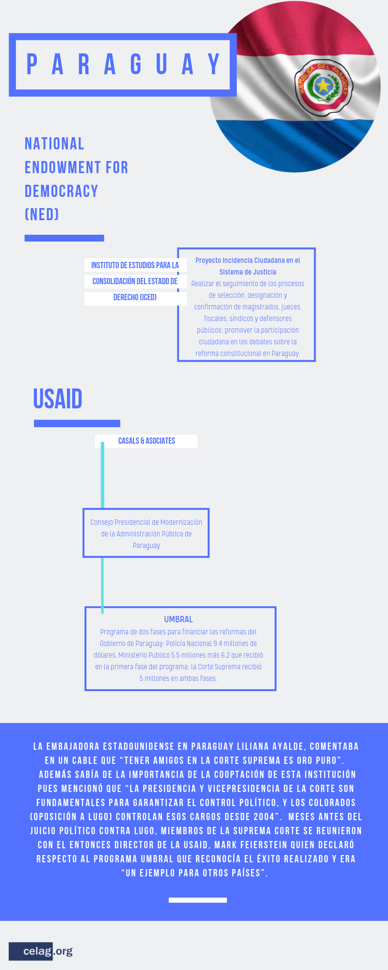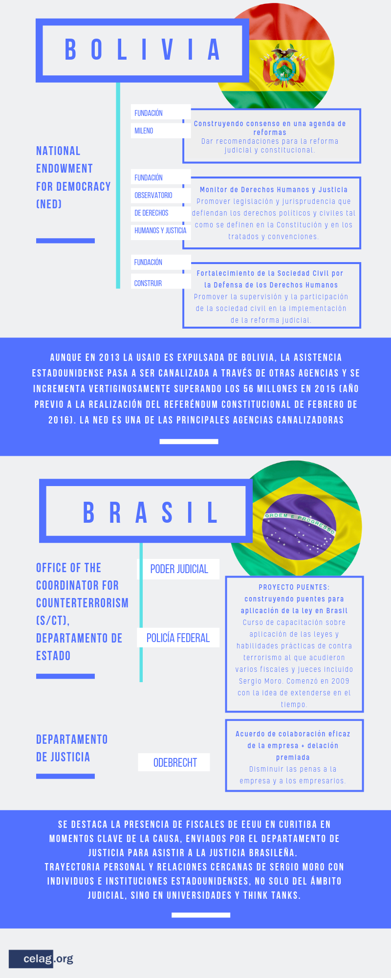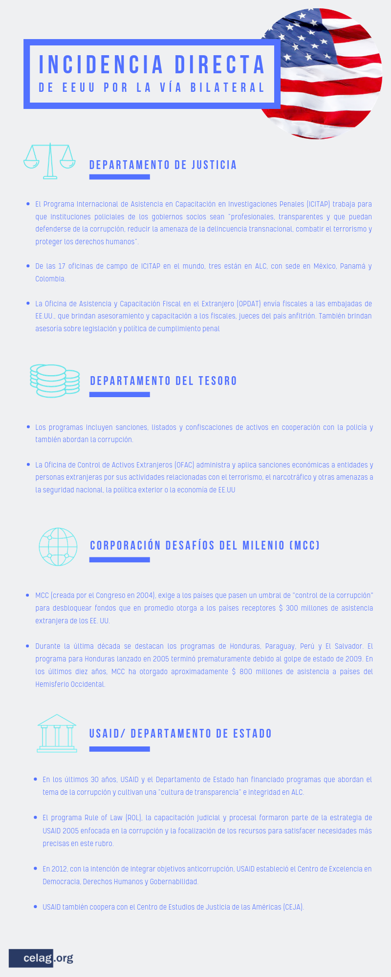 En el ámbito bilateral, y ya en el terreno de la intervención directa en las instituciones de otros países, destaca el accionar de la Agencia de los Estados Unidos para el Desarrollo Internacional (USAID) y agencias del Gobierno asociadas (National Endowment for Democracy, National Democratic Institute, International Republican Institute, Fundación Milenio), así como empresas y Organizaciones No Gubernamentales íntimamente articuladas con aquéllos y que ejecutan los programas de asistencia jurídica (Checchi and Company, ConsultingInc, Chemonics, Casals & Associates, etc.). A estos se suman los departamentos de Justicia y del Tesoro, a través de normativas y programas de cooperación bilaterales con países de la región para “reforzar instituciones y cultivar una cultura de transparencia e integridad”. La Corporación del Desafío del Milenio (agencia “independiente” del Gobierno de EE. UU. dedicada a la asistencia exterior)[4] exige a los países que pasen un umbral de “control de la corrupción” para desbloquear fondos, y los programas del Departamento del Tesoro incluyen sanciones, listados y confiscaciones de activos en cooperación con la policía en caso de que la corrupción no se controle de acuerdo a los estándares propuestos por EE. UU.[5]