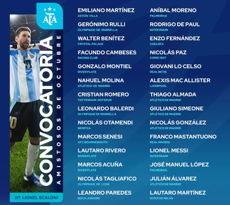 El técnico de la Selección Argentina, Lionel Scaloni, dio una lista para los amistosos del próximo viernes 10 ante Venezuela en Miami y el lunes 13 ante Puerto Rico en Chicago en la que conviven la mayoría de los jugadores habituales del plantel con las primeras citaciones de Facundo Cambeses (Racing), Lautaro Rivero (River) y Aníbal Moreno (Palmeiras), la ratificación de José Manuel López (Palmeiras) entre los delanteros y el regreso de Marcos Senesi (Bournemouth). En total, Scaloni llamó 28 futbolistas entre los que se incluye al capitán Lionel Messi y a Franco Mastantuono, de auspicioso arranque en Real Madrid.
